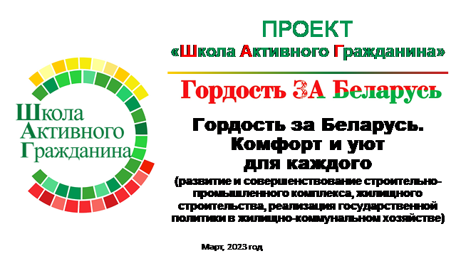 23 марта 2023 года во всех учебных группах первого курса прошло занятие в рамках проекта «Гордость за Беларусь. Комфорт и уют для каждого» (развитие и совершенствование строительно-промышленного комплекса, жилищного строительства, реализация государственной политики в жилищно-коммунальном хозяйстве).