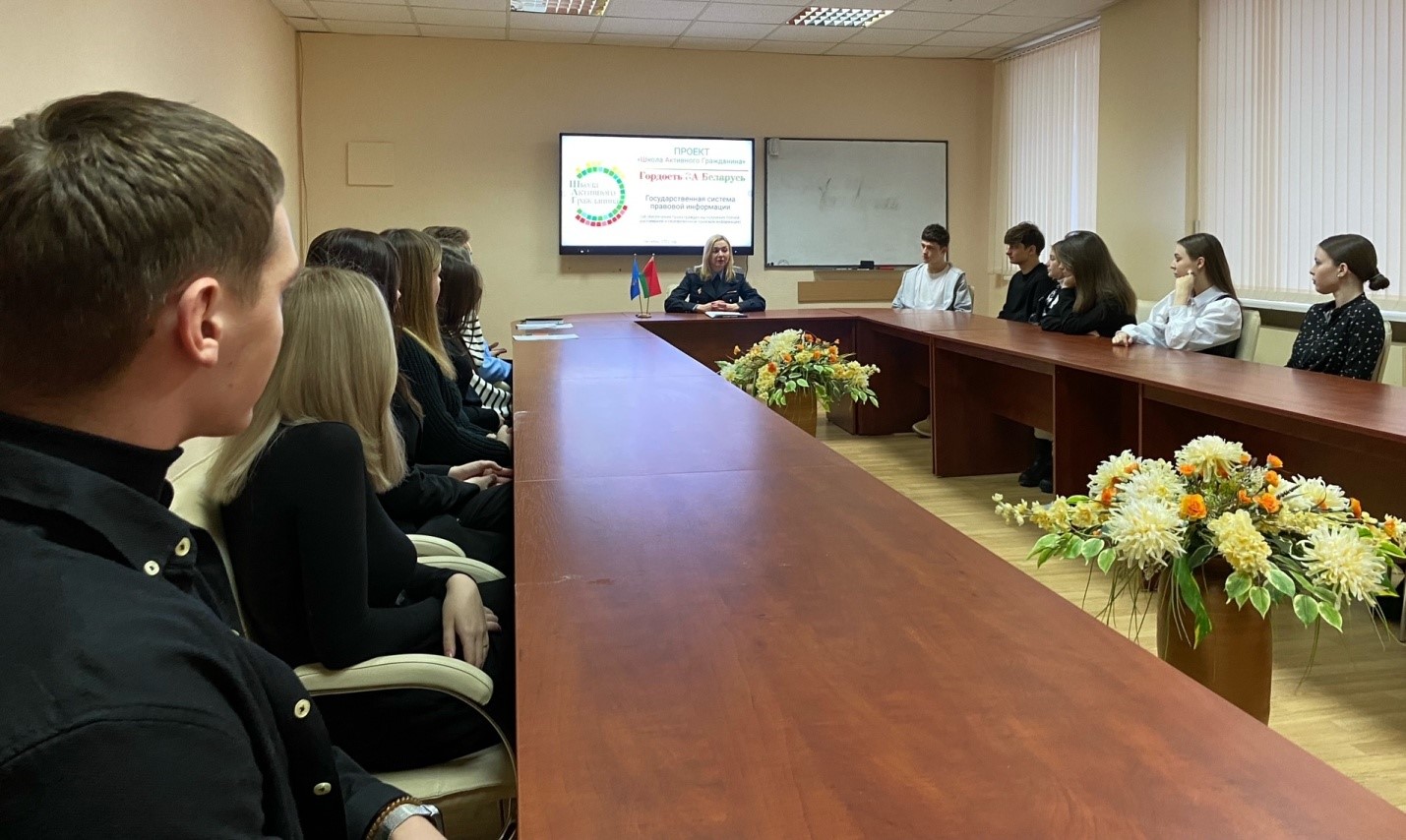 В рамках встречи учащиеся филиала обсудили вопросы по теме «Гордость за Беларусь. Государственная система правовой информации» (об обеспечении реализации прав граждан и юридических лиц на получение полной, достоверной и своевременной правовой информации).