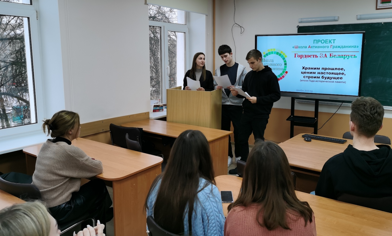 22 декабря 2022 года в учебных группах 1 и 2 курсов, а также в общежитии филиала прошли мероприятия в рамках проекта «Школа Активного Гражданина» на тему Гордость за Беларусь. Храним прошлое, ценим настоящее, строим будущее» (итоги Года исторической памяти).