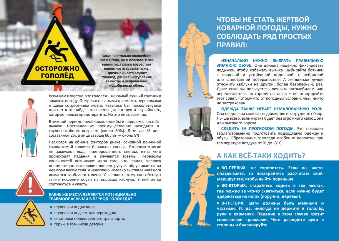 • в период гололеда необходимо соблюдать осторожность, передвигаться медленно, короткими шагами;